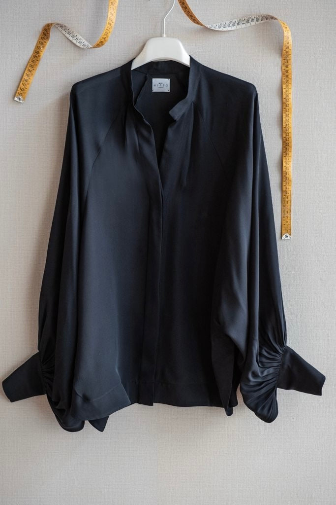 Linee pulite delineano la sofisticata eleganza della Blusa con ampie maniche in Pura Seta crêpe de chine . I dettagli ricercati la rendono non banale capace di aggiungere una nota eterea al tuo look grazie alle particolari  maniche chiuse da un polso dalla forma tondeggiante e alla silhouette fluida del modello con collo mezzo coreana aperto e abbottonatura nascosta.